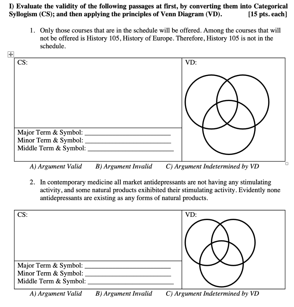 Categorical syllogism venn diagram generator. A categorical syllogism is valid if its two premises together imply the conclusion. That is, if the two premises are true, then the conclusion must be true. 30 Apr 2020 — In a Venn diagram for categorical propositions, shading in a region is used to indicate that the region is empty (for type A and E statements), ... When we analyze a categorical syllogism with Venn diagrams, we need three ... link to see how to generate the template in Paint so you can shade and mark. CLICK the image to access our free online learning materials in Ethics. Being aware of these “external and material elements around us” which we interact (implicitly and explicitly) with and incorporate (consciously and unconsciously) into how we do things with and for ourselves and in relation to and with others is, therefore, necessary in understanding why we respond to issues and to ...