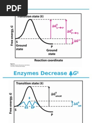 Enzyme reaction coordinate diagram. ENZYME-CATALYZED REACTIONS · by JM Scholey · 2013 · Cited by 6 — Reaction coordinate diagram of an idealized enzyme-catalyzed reaction. The reaction coordinate diagram shows that, to ... When the S P reaction is catalyzed by an enzyme, the ES and EP complexes are intermediates (Eqn 8-1); they occupy valleys in the reaction coordinate diagram (.Fig. 8-4). When several steps occur in a reaction, the overall rate is determined by the step (or steps) with the highest activation energy; this is called the rate-limiting step. Biology questions and answers. Use the reaction coordinate diagram of an enzyme catalyzed reaction shown below to answer Questions 5 through 10 From this diagram you can conclude: (A) The forward reaction is endergonic. (B) The forward reaction is exothermic. (C) The forward reaction is endothermic. (D) The forward reaction is at equilibrium. A Reaction Coordinate (Energy) Diagram Thermodynamic Quantities Gibbs standard free energy change (ΔGo) Enthalphy (ΔHo): the heat given off or absorbed during a reaction Entropy (ΔSo): a measure of freedom of motion ΔGo = ΔHo - TΔSo ΔG,ΔH,ΔS, ΔE are state functions If ΔSo is small, compared to ΔHo, then ΔGo o ΔE = q + w! ΔH = q p!