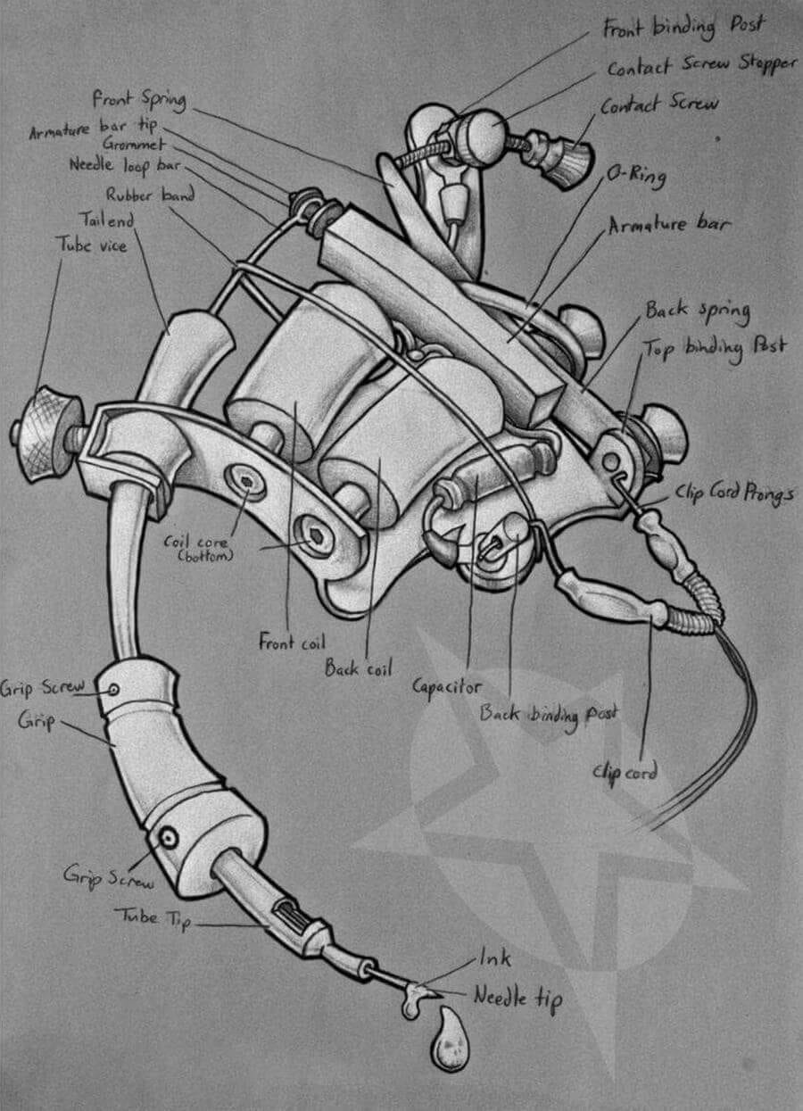 Here is our newly updated tattoo machine anatomy diagram for 2019. Some of the names for the diagram may be different depending on which part of the country you are from, for example, some people call the back binding post a back post, spring screw, deck screw, my friend Jerry calls them his ex-wife… etc..