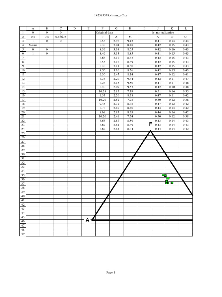 Triangle diagrams in Excel! Template. " Triangle outline coordinates More sample coordinates Makes sure sum = 100 Raw coordinates Plot these columns Intermediate calcs Raw sample data Preliminary values go in these columns Change only these three columns Don't change these columns Don't change these columns either Step 1.