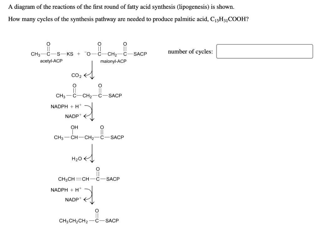 A diagram of the reactions of the first round of fatty acid synthesis (lipogenesis) is shown below. How many cycles of the synthesis pathway are needed to produce palmitic acid, C_15H_31COOH?