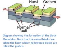 Fault block mountains diagram. Block Mountains are formed when two tectonic plates move away from each other causing cracks on the surface of the Earth. When parallel cracks or faults occur, the strip of land or the block of land between them may be raised resulting in the formation of block mountains. The upward block is called a horst. Examples, Black forest and the Vosges ... The mountains formed in this fashion are known as fault block mountains. Geologically, the rise is known as a horst, whereas the corresponding depression is known as a graben.This near-textbook formation can be seen in the basin of the river Narmada in central India, which is a graben between the two horsts of the Satpura mountain range in the south and the Vindhya mountain range in the north. one fault block and looking toward the fault line. If objects on the opposite side of the fault appear to have been translated to the left, that fault would be considered a left lateral strike slip fault. If objects appear to have shifted to the right (as in Figure 4), the fault is considered to be a right lateral strike slip fault. An example of fault block mountains is the Sierra Nevada mountain range in California. Show pupils the photograph of this mountain range. Show pupils the diagram of a dome mountain: Dome mountains are the result of a great amount of molten rock (magma) pushing its way up under the Earth’s crust. Without actually