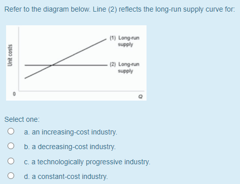 Line (1) in the diagram reflects the long-run supply curve for. Line (1) reflects the long-run supply curve for: an increasing-cost industry. Assume a purely competitive firm is maximizing profit at some output at which long-run average total cost is at a minimum. Transcribed image text: Refer to the diagram below. Line (2) reflects the long-run supply curve for: (1) Long run supply Unit costs (2) Long-run supply Select one: a. an increasing-cost industry. b. a decreasing-cost industry. c. a technologically progressive industry. d. a constant-cost industry. Line (1) reflects the long-run supply curve for. an increasing-cost industry. Refer to the above diagram. Line (2) reflects the long-run supply curve for. a constant-cost industry. Refer to the above diagram. Line (1) reflects a situation where resource prices. increase as industry output expands. The long-run supply curve for a purely competitive increasing-cost industry will be upsloping. ... Line (1) in the diagram reflects the long-run supply curve for. answer choices . a constant-cost industry. a decreasing-cost industry. an increasing-cost industry.