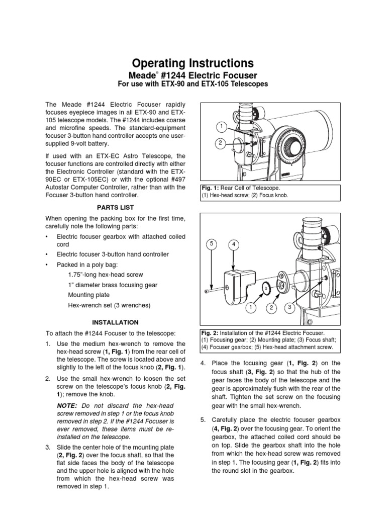 Meade telescope parts diagram The red dot finder is of a type not seen on other Meade models and is robustly fitted. To anyone who admires Meade older products there are some little reminders of the past. The build quality of the ETX-LS impresses immediately. The whole telescope construction feels solid - nothing moves, wobbles