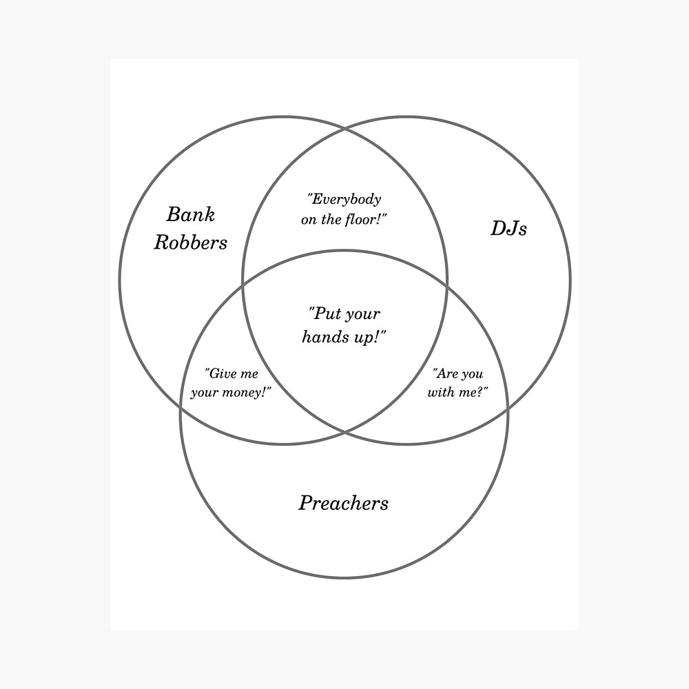 Aug 22, 2018 — The diagram is flawed in a way that makes its Venn-diagramicity questionable, since Bank Robbers, DJs, and Preachers appear to be properties ...Put Your Hands in the Air - Even more complexAug 23, 2018Put your hands in the air (repost) : r/VennDiagramsAug 23, 2018Everybody put your hands up! : r/memesAug 24, 2018PUT YOUR HANDS UP!! : r/funnyDec 14, 2018More results from www.reddit.com