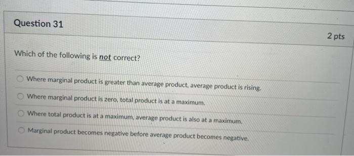 Economics questions and answers. ATC AVC 0 Q Refer to the diagram. If labor is the only variable input, the marginal product of labor is at a Multiple Choice minimum at point b. minimum at point a maximum at point a maximum at noint h Marginal product Multiple Choice is always less than average product. may initially increase, then diminish, but never become negative. may initially.