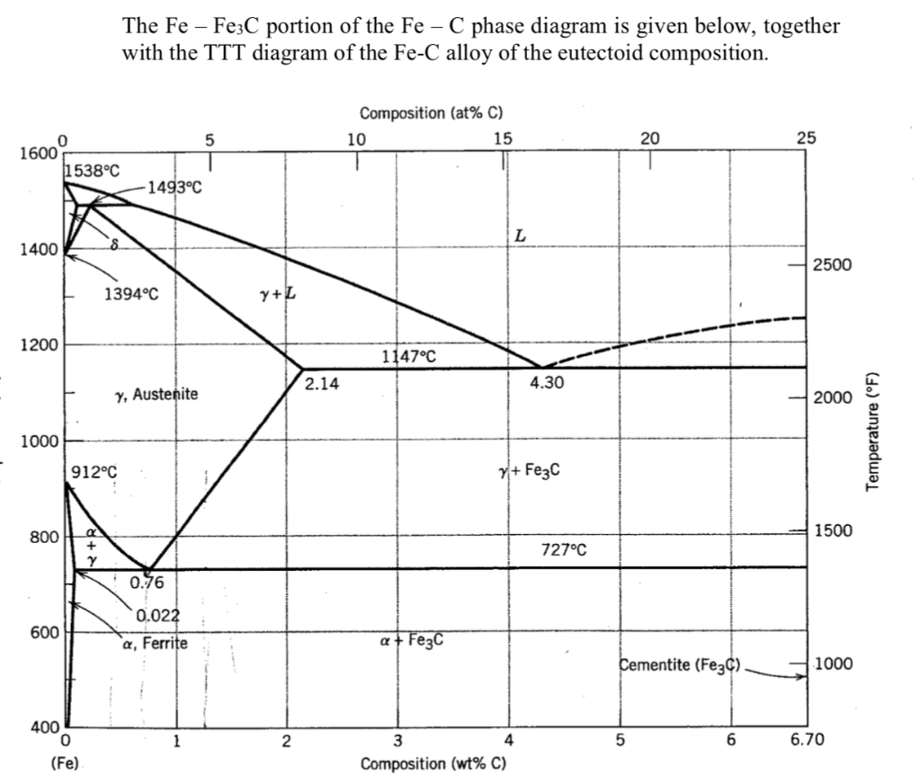 Fe-Fe3C T-T-T Diagram. Fe-Fe 3 C T-T-T Diagram, Adapted from Callister pg. 295, Fig. 10.6. The time-temperature transformation curves correspond to the start and finish of transformations which extend into the range of temperatures where austenite transforms to pearlite. Above 550 C, austenite transforms completely to pearlite. Fe-C phase diagram Fe-Fe 3C phase diagram is given on the last page of the exam. _____ Multiple choices (2.5 points each): ____ 1. A phase is defined as a matter with A. distinct composition B. distinct structure ... But the pearlite is composed of Fe3C(carbide) and Ferrite , So at the end, the whole structure is composed of Ferrite and Fe3C(carbide). In presented paper the algorithm for Fe-Fe3C phase diagram calculation and developed computer program, PD_Fe_Fe3C are presented. Results of calculations using this program were compared with date ...