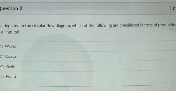 True False 1 / 1 pts Question 3 True or false: If prices rise on average in the U.S. economy, the purchasing power of a dollar declines. True False 1 / 1 pts Question 4 True or false: In the circular flow diagram, the value of all the income in the economy is greater than the value of goods and services produced in the economy.