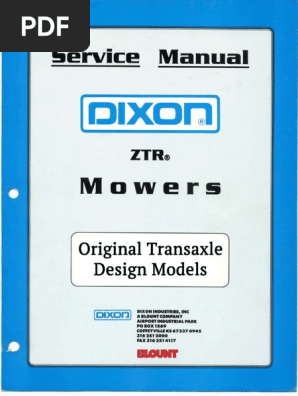 Dixon Lawn Mower Parts are available for quick shipment. Browse our Dixon Parts diagrams and order your Dixon ZTR Parts today! Download a free Dixon transaxle service manual to repair, rebuild or adjust the mechanical transmission on your older Dixon Mower.We also have Hydro-Gear transmission parts available for your late model Dixon ZTR as well.
