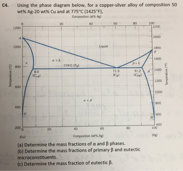 Engineering; Chemical Engineering; Chemical Engineering questions and answers; A phase diagram for Copper (Cu) - Silver (Ag) alloys is shown below: Composition (at% Ag) 20 40 60 80 100 1200 2200 А 2000 -Liquidus 1000 Liquid 1800 F -Solidus a +L 1600 ar 800 B+L 779°C (Tg) B 8.0 E 71.9 (Ce) G B 1400 Temperature (°C) 91.2 (Cag) (CB) Temperature (°F) 1200 600 Solvus 1000 800 400 с 600 H 2006 ... Download scientific diagram | Cu-Ag Phase Diagram. The eutectic composition is 28.1 wt% Cu-71.9 wt% Ag and the solid solubility limit of silver in copper is 8 wt% Ag (after Hansen and Anderko 1958 ... Download scientific diagram | Silver–copper phase diagram. from publication: Direct method for determining the segregation in silver-copper solid solutions not prone to brittle breakage of grain ... 9.32 For a copper-silver alloy of composition 25 wt% Ag-75 wt% Cu and at 775 °C (1425 °F) do the following: ... The illustration below is the Cu-Zn phase diagram (Figure 9.19). A vertical line at a composition of 68 wt% Zn-32 wt% Cu has been drawn, and, in addition, horizontal arrows at the four temperatures called for in the ...
