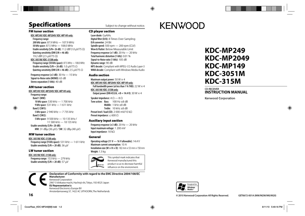 Kenwood's KDC-MP108 CD receiver offers you major-league performance at a minor-league price. It plays your prerecorded and recordable CDs, even discs filled with MP3 and WMA files. If you're bringing a portable music player along for the ride, this receiver features an illuminated aux input that's easy to find in the dark.