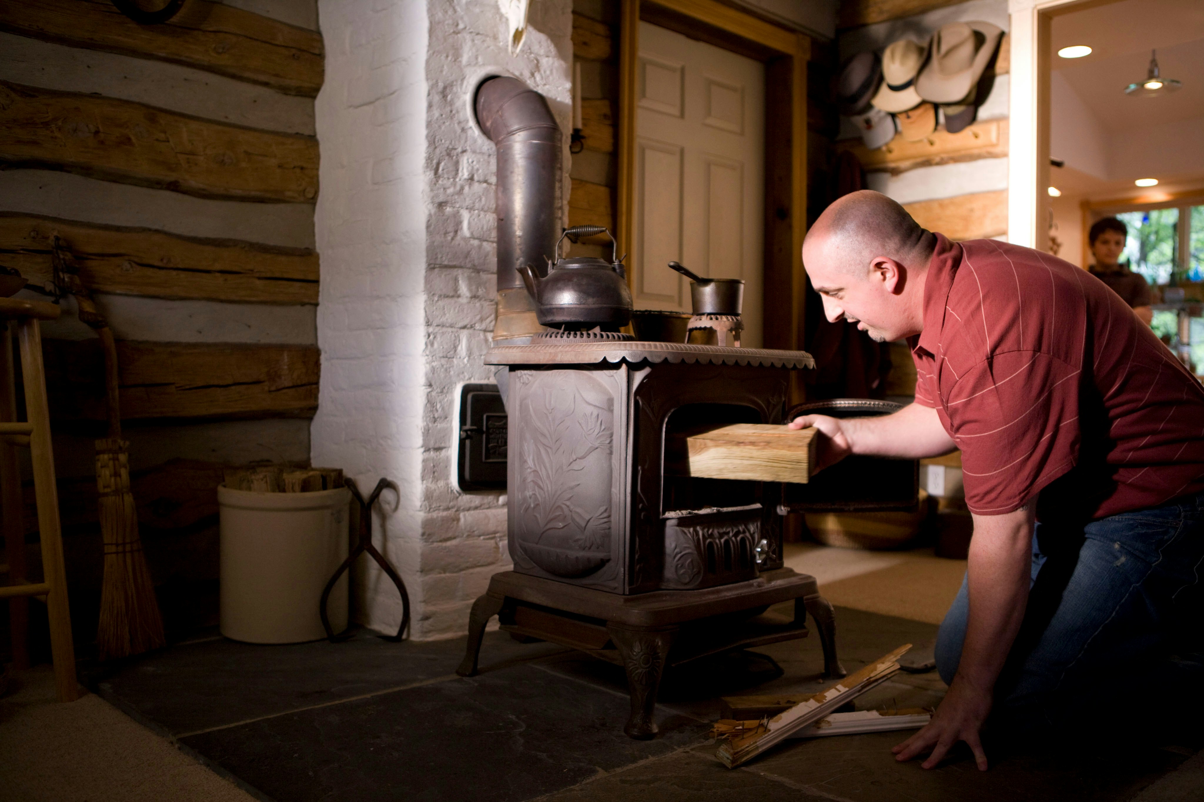 This homeâs interior, though beautiful, houses a potential hazard on many levels, therefore, special care need be taken in order to safely operate this wood-burning stove, for not only does it generate a terrific amount of heat, it does so using flame, rather than electricity, which is much more difficult to control. This man was about to place what appears to be a piece or treated lumber into the stove as fuel.