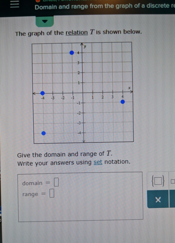 Domain and range mapping diagram. In mathematics, a conformal map is a function that locally preserves angles, but not necessarily lengths.. More formally, let and be open subsets of .A function : → is called conformal (or angle-preserving) at a point if it preserves angles between directed curves through , as well as preserving orientation. b)&{(G3,G4),(G1,2),(0,0),(G3,5),(2,4)}&& Domain:& & & Range:& & & & & Isthisrelationafunction?& & & & 4)&State&the&domain&and&range&of&each&relation.&Then&state&if ... For example, if f is a function that has the real numbers as domain and codomain, then a function mapping the value x to the value g(x) = 1 / f(x) is a function g from the reals to the reals, whose domain is the set of the reals x, such that f(x) ≠ 0. The range or image of a function is the set of the images of all elements in the domain. The range is the same as the codomain. This is a one to one function. The range is a subset of the codomain. is a many to one function. The range is a subset of the codomain. This mapping is not a function. Each member of the domain is associated with two distinct members of the co-domain. It is a one-many relation. This mapping is not a function.