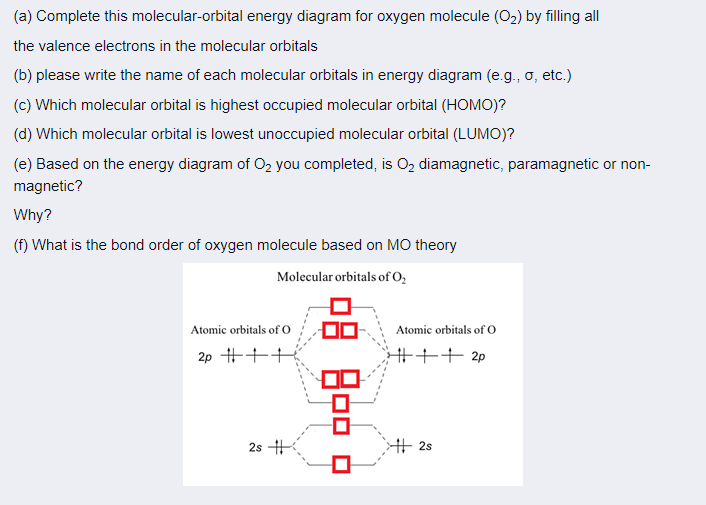 (PDF) Inorganic Chemistry Housecroft | Yurika Almanda ... Pembuatan Senyawa kompleks asetial asetanoat. Enter the email address you signed up with and we'll email you a reset link. (Get Answer) - Sketch the Molecular Orbital diagram for O2 ... Sketch the Molecular Orbital diagram for O2 being sure to: A. Designate bonding and anti-bonding orbitals, B. Show the location of all electrons in the molecular orbitals, C. Calculate the bond order, and D. Indicate whether this molecule is paramagnetic or diamagnetic. For your diagram, assume that one oxygen atom contributes its six (6) valence electrons to the molecule and the other oxygen contributes seven (7) valence electrons to the molecule.