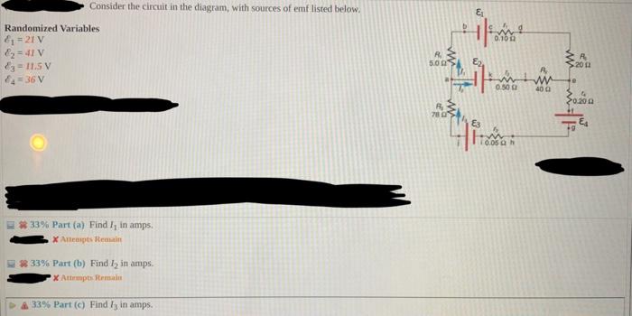 Consider the circuit in the diagram, with sources of | Chegg.com Consider the circuit in the diagram, with sources of emf listed below. Randomized Variables. ℰ1 = 21 V. ℰ2 = 48 V. ℰ3 = 14.5 V. ℰ4 = 39 V. a) Find I1 in amps. b) Find I2 in amps. c) Find I3 in amps.