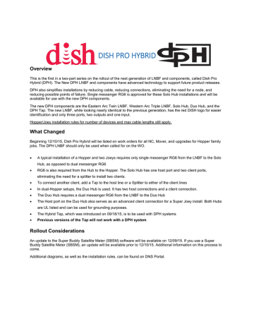 Dish 1000.2 Antenna with Dish Pro Plus LNBF RG-6 Coax lines Hopper 3 DISH Pro Hybrid Solo Hub RG-6 Coax To Splitters and then Joeys (As shown on previous wiring diagram) Max 6 Joey thin-client receivers in same video network as each Hopper 3 (Joeys, 4K Joeys, Wireless Joeys) Hopper 3 RG-6 Coax Amplifier DISH Pro Hybrid 42 Switch RG-6 Coax ...