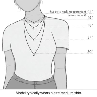Necklace chain length diagram. Learn about chain length to better understand sizing. See examples of chain length from 20 inches to 30 inches. We sell all types of chains, customize yours. Phone : 888-485-1061 ... Gold Necklace Under $350. Chain & Pendant Under $220 Gold Plated Necklace . All Gold Plated Necklace ... Note: The diagram is general guideline, as sizing and fit may vary from person to person. NECKLACE SIZE CHART RING SIZE CHART MEASURING YOUR BRACELET US RING SIZE EUROPEAN RING SIZE 4.5 48 5 50 6 52 7 54 7.5 56 8.5 58 9 60 10 62 10.5 64 LENGTH (cm) LENGTH (in) 16 6.3 17 6.7 17.5 6.9 18 7.1 19 7.5 20 7.9 20.5 8.1 21 8.3 23 9.1 24 9.4 25 9.8 26 ... Chain Length Reference. The following chain length diagram is provided for reference. Depending on body type, the location of where the chain falls may vary. We use cookies (and other similar technologies) to collect data to improve your shopping experience.By using our website, you're agreeing to the collection of data as described in our ... When the pendant is placed on a chain of known length, the bottom of the pendant—and the necklace overall—will extend down your front by the length of the pendant. In other words, if you have a 2 inch (5 cm) pendant placed on an 18 inch (45 cm) chain, the necklace will land 2 inches (5 cm) below the collarbone. [15]
