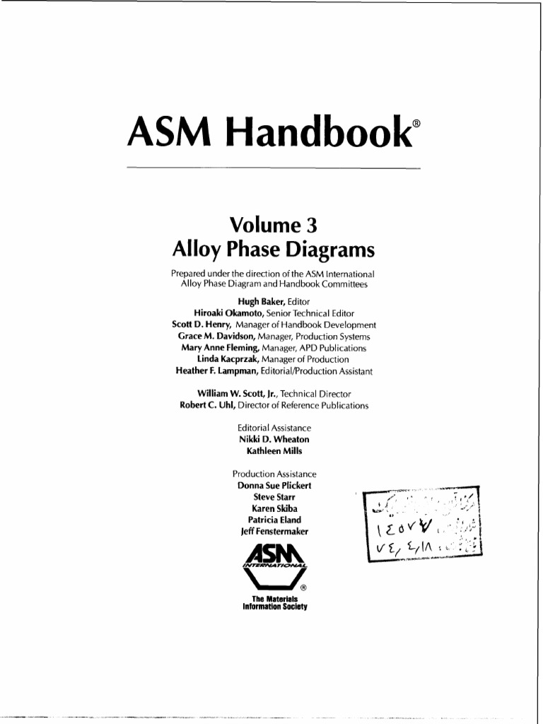 Get this from a library! ASM handbook. Volume 3, Alloy phase diagrams. [Hiroaki Okamoto; ASM international. Alloy phase diagram committee.; Asm international. Handbook committee.; et al]