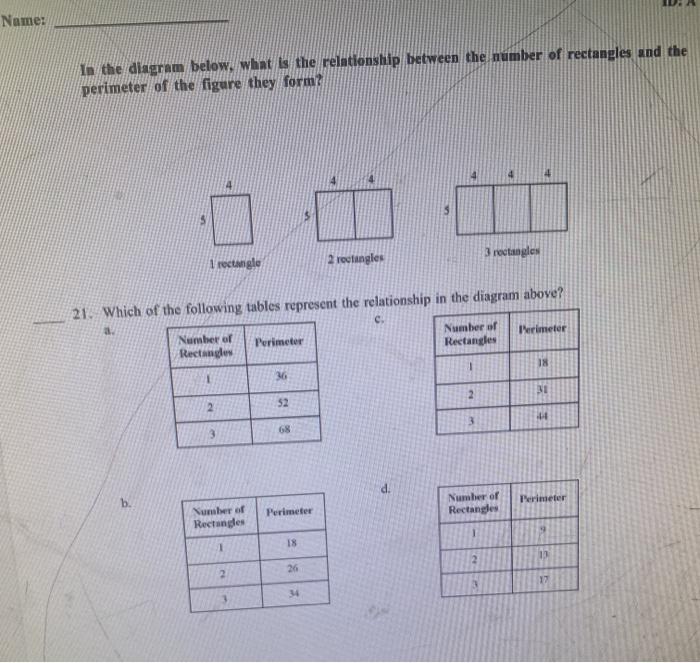 in the diagram below what is the relationship between the number of rectangles in the perimeter of the figure they form 13in the idiagram below what is the relationship between the number of 00877
