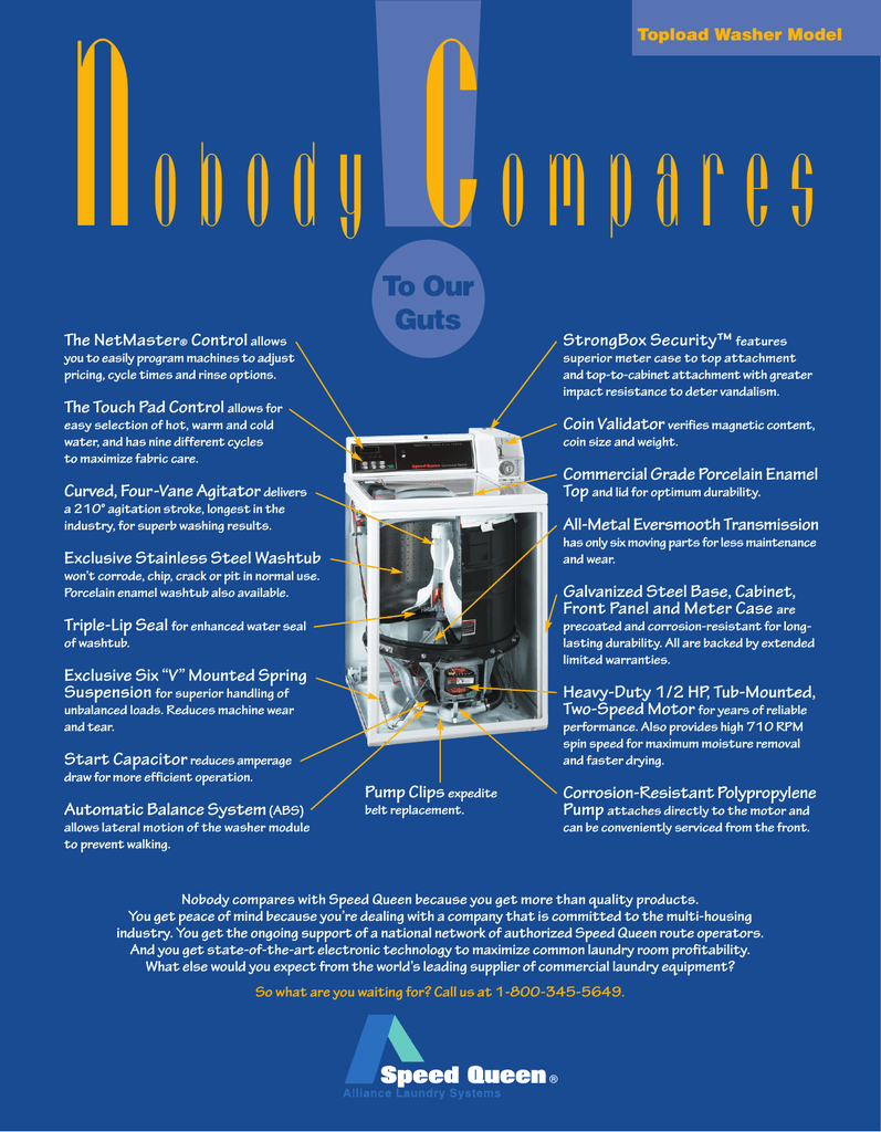 All Speed Queen catalogs and technical brochures Website: Speed Queen Group: Alliance Laundry Systems. 2 Pages. Energy Efficient Peak Performance Commercial Top Load Washer.