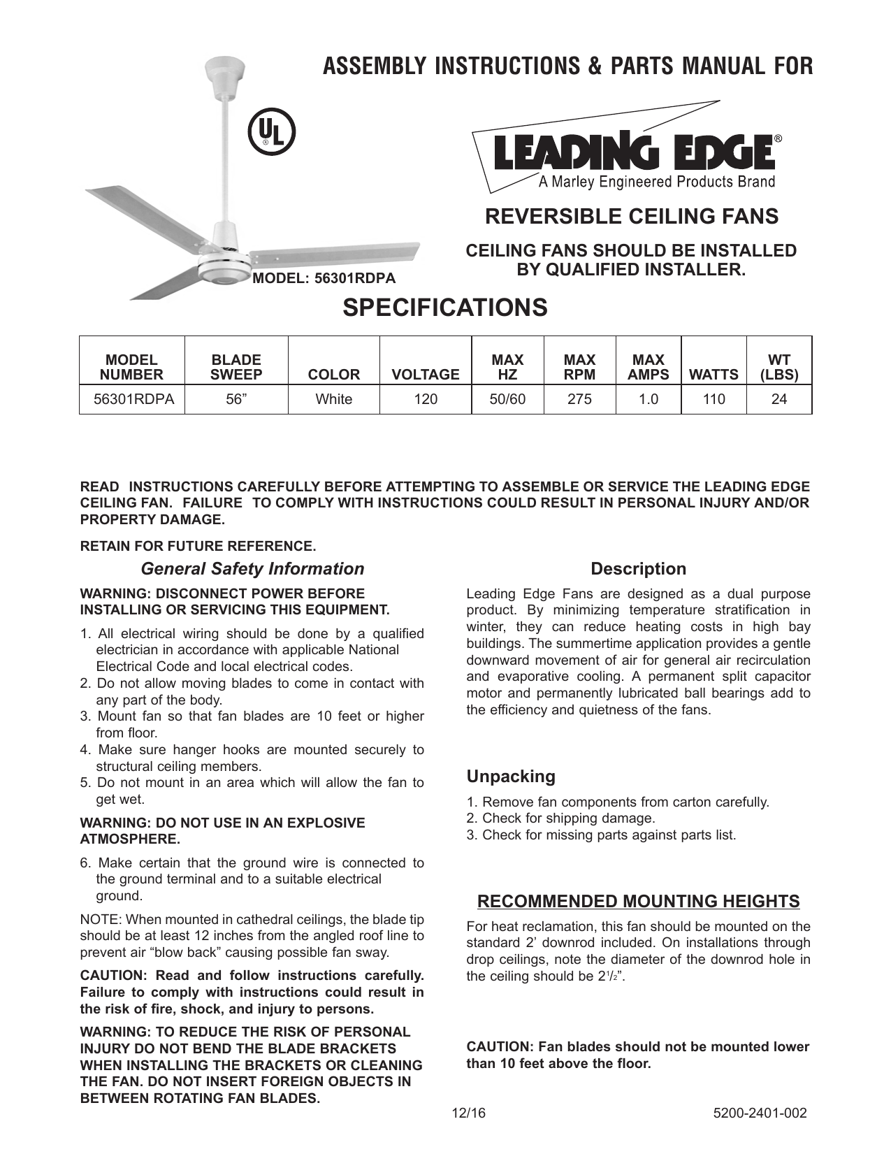 PDF INSTRUCTION MANUAL - Kichler 6. The fan must be mounted with a minimum of 7 feet clearance from the trailing edge of the blades to the floor. 7. To operate the reverse function on this fan, press the reverse button while the fan is running. 8. Avoid placing objects in the path of the blades. 9. To avoid personal injury or damage to the fan and other items, be