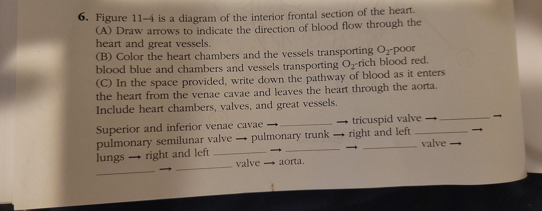 Solved 6. Figure 11-4 is a diagram of the interior frontal ... Figure 11-4 is a diagram of the interior frontal section of the heart. (A) Draw arrows to indicate the direction of blood flow through the heart and great vessels. (B) Color the heart chambers and the vessels transporting O2-poor blood blue and chambers and vessels transporting O2-rich blood red.