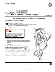 Graco Magnum ProX17 Cart Airless Paint Sprayer 17G178 The ProX17 can support to up 150 ft. of paint hose. The ProXChange Pump Replacement System allows you to replace the pump on Customer review from magnum.graco.com. After a fair amount of research I purchased the Magnum X17. I had primed the all wood parts (table and chairs) with a... Graco Replacement Kits For Magnum | PDF | Valve | Pump Replacement Kits for Magnum 3A5572B. Project Painter Plus, X5, X7, LTS15 and LTS 17 EN Important Safety Instructions For detailed sprayer PRESSURE SWITCH. MOTOR WHITE ti14050a. 2 3A5572B EN Project Painter Plus Diagram and Parts. Ref Part # Description Qty Ref Part... Graco Magnum X7 Airless Sprayer | X7 | eReplacementParts.com Use our part lists, interactive diagrams, accessories and expert repair advice to make your repairs easy. Graco X7 (16J751) Magnum X7 Airless Sprayer Parts. Search within model. Graco MAGNUM LTS 15 257060 Manual, Graco... | Guidessimo.com MM 313034 Graco Headquarters: Minneapolis International Offices: Belgium, China, Japan, Korea GRACO INC. AND SUBSIDIARIES • P.O. BOX 1441 For LTS 15 and LTS 17 models: only use water-based or mineral spirit-type materials with a flash point greater than 70 ° F (21° C). • Paint or...