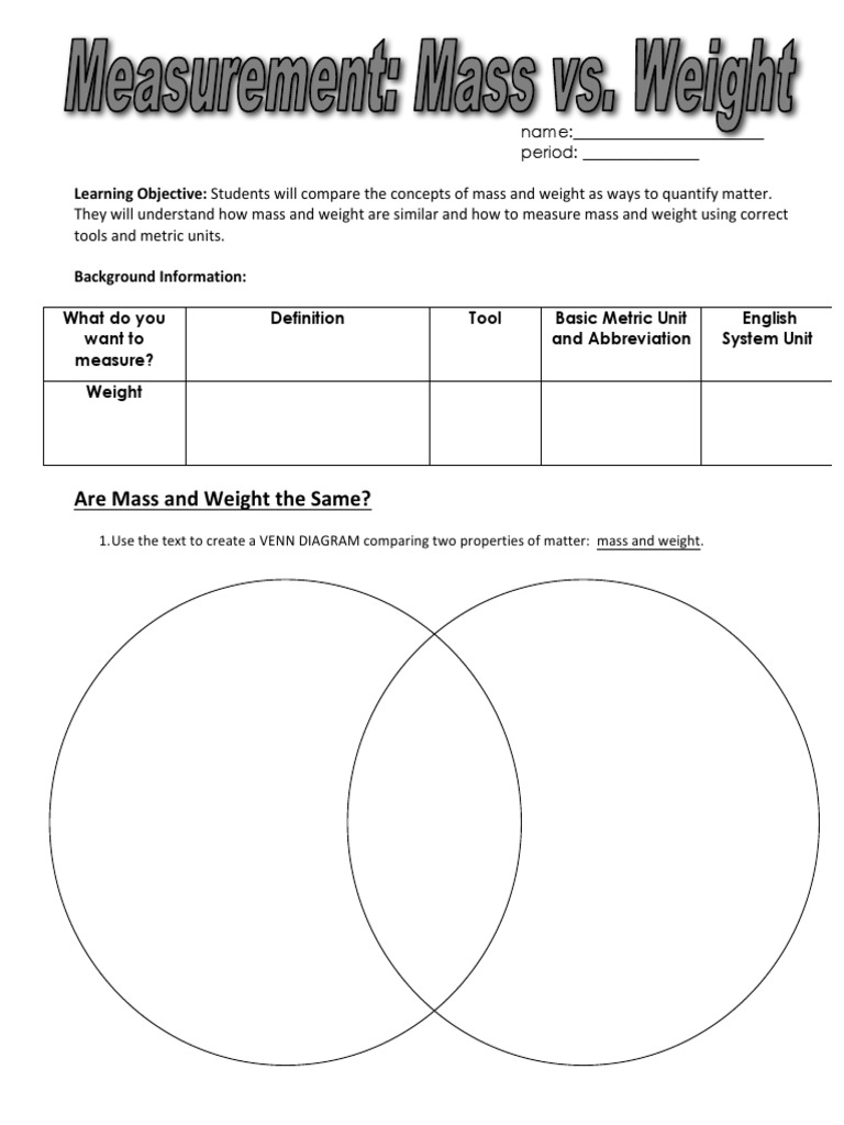 Venn Diagram Mass Vs Weight (physical science matter) by ... One page Venn Diagram - comparing Mass Vs Weight - good for physical science teacher. Total Pages. 1 page. Answer Key. N/A. Teaching Duration. N/A. Report this Resource to TpT. Reported resources will be reviewed by our team. Report this resource to let us know if this resource violates TpT's content guidelines. Reviews.