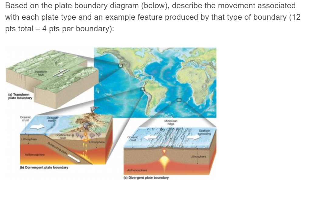 Transform plate boundaries diagram. Transform Plate Boundaries - Geology (U.S. National Park ... The San Andreas Fault Zone is not the only active transform plate boundary with U. S. National Park Service sites. Southeast of Florida, the Caribbean Plate is sliding east-northeast about 0.8 inches (2 centimeters) per year relative to the North American Plate. Both plates are capped by oceanic crust. HW 06 - Ch 6: Plate Tectonics Flashcards | Quizlet The three diagrams below show the three types of stresses: tension, compression, and shear. Determine which of these stresses would be found at transform plate boundaries, and place them in the appropriate bin. Drag the appropriate items into their respective bins. Each item may be used only once. Plate Boundaries Diagram | Quizlet takes place at convergent boundaries of tectonic plates where one plate moves under another and is forced or sinks due to gravity into the mantle. ... Diagram of a Transform Boundary. Boundary Type that Creates Mid-Ocean Ridges, Volcanoes. Ocean-Ocean Divergent Boundary. Transform Boundary: Definition, Facts & Examples - Video ... The fracture zone that forms a transform plate boundary is called a transform fault. True | False 2. Similar to convergent and divergent boundaries, a new crust is also created at transform ...