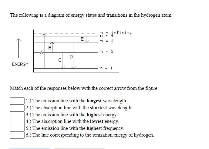 Solved The following is a diagram of energy states and ... The following is a diagram of energy states and transitions in the hydrogen atom. : Anfinity FI n 1 B A n. 2 D C ENERGY Match each of the responses below with the correct arrow from the figure. 1.) The emission line with the longest wavelength. 2.) The absorption line with the shortest wavelength. 3.) The emission line with the highest energy. 4.)
