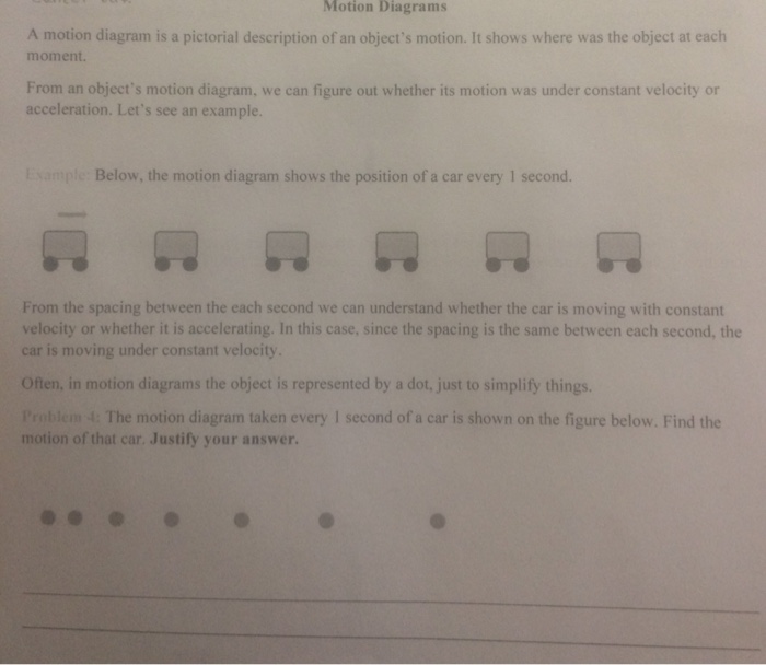 You throw a ball upward. (a) Draw a motion diagram and two ... Find step-by-step Physics solutions and your answer to the following textbook question: You throw a ball upward. (a) Draw a motion diagram and two force diagrams for the ball on its way up and another motion diagram and two force diagrams for the ball on its way down. (b) Represent the motion of the ball with a position versus-time graph and velocity-versus-time graph.. PDF Motion Distance and Displacement - Livingston Public Schools Motion is described with respect to a: a.Graph b.Displacement c.Slope d.Frame of reference Pg. 18 . Why is it necessary to choose a single reference point (frame of reference) when measuring motion? DO NOW: The motion appears to be different in different frames of reference. ... Vector Diagrams •1 block East Vector A •1 block North Vector B ... (PDF) Teacher roles during amusement park visits ... Amusement parks offer rich possibilities for physics learning, through observations and experiments that illustrate important physical principles and often involve the whole body. Amusement parks are also among the most popular school excursions, but PDF Quiz 10 - Posttest Motion 9. Which of the motion diagrams to the right could be a descending rocket slowing to make a soft landing on Mars? a. A b. B c. C d. None of them 10. Which of the motion diagrams to the right could be a dust particle settling to the floor at constant speed? a. A b. B c. C d. None of them 11. The diagram below shows an object a. moving at a ...