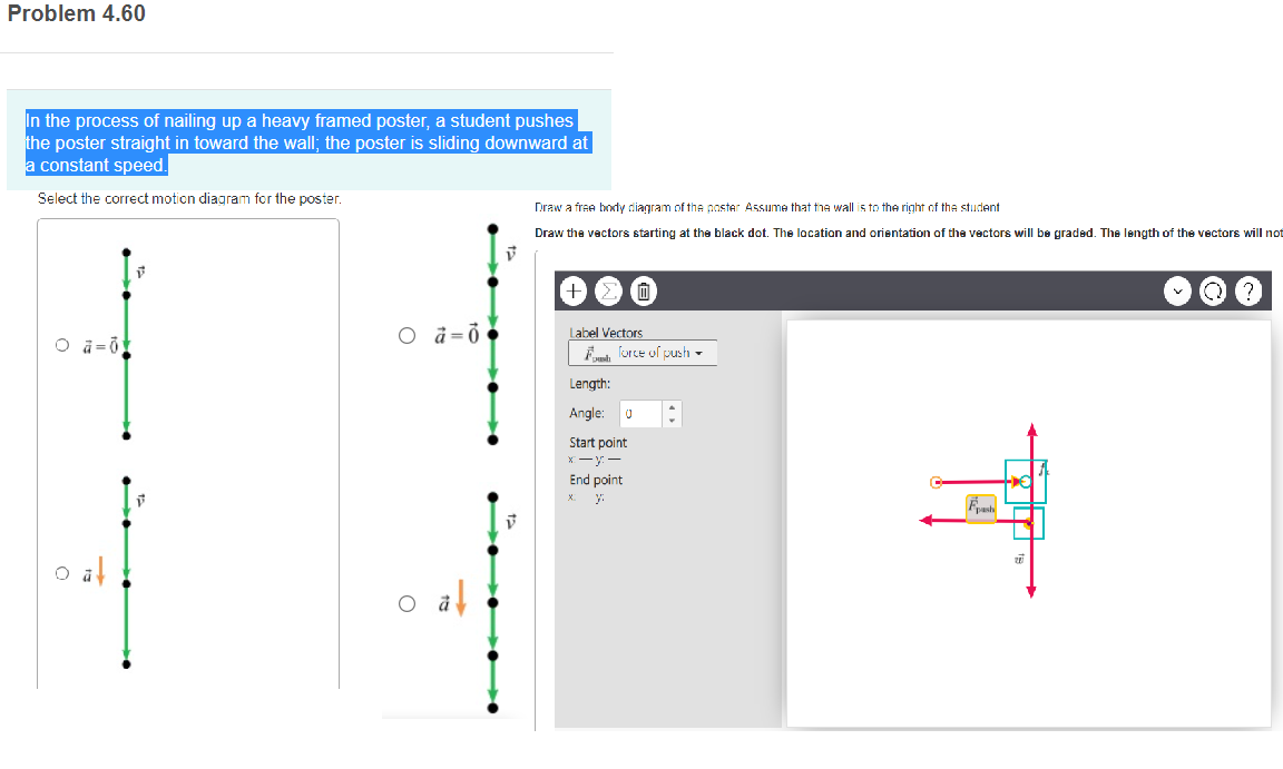 Solved In the process of nailing up a heavy framed poster ... Draw a free-body diagram of the poster. Assume that the wall is to the right of the student. Question: In the process of nailing up a heavy framed poster, a student pushes the poster straight in toward the wall; the poster is sliding downward at a constant speed. Draw a free-body diagram of the poster.