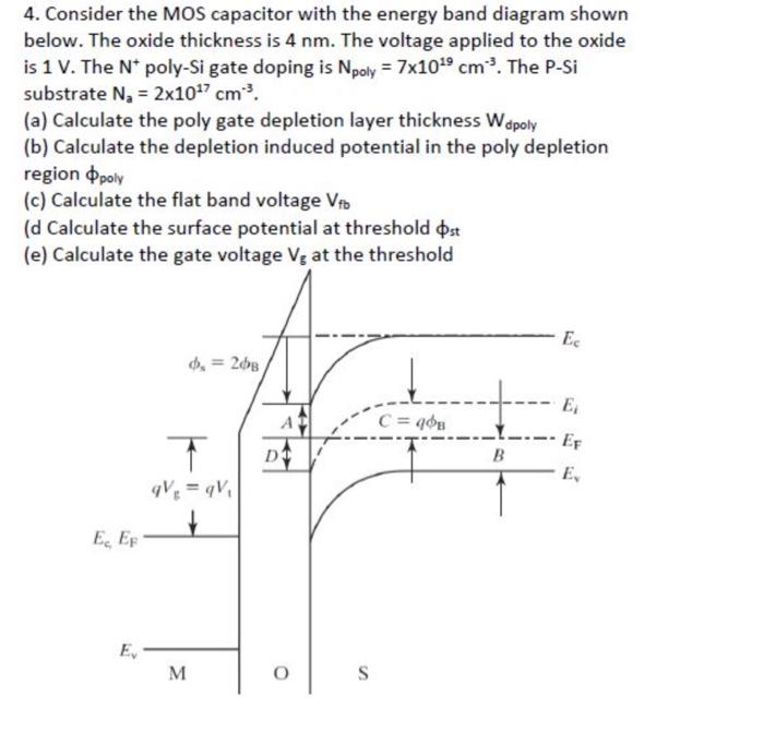 Solved 3. A. Define electron affinity in the semiconductor ... A. Define electron affinity in the semiconductor of an MOS capacitor. B. Sketch the energy-band diagram through an MOS structure with a p-type substrate and an nt polysilicon gate under zero bias. C. Define flat-band voltage. D. Define threshold voltage. 4. A. Sketch the C-V characteristics of an MOS capacitor with an n-type substrate under the ...